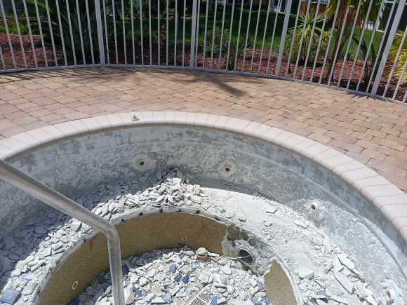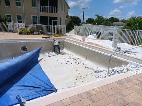 After the pool and spa were drained, the old ceramic tile was removed and replaced. Any concrete surfaces that were not up to par were chipped away and repairs were made.