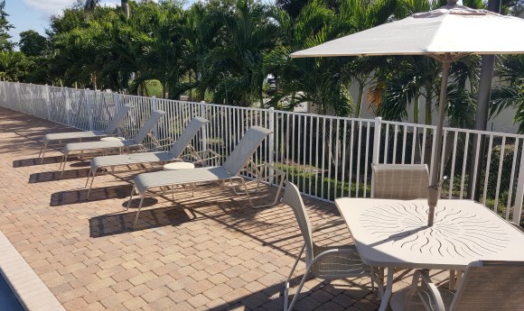 New furniture was purchased for the pool recently. 14 loungers which are nineteen inches high, 14 chairs, a dinning table, umbrella and base. The small side tables were repaired and painted.
